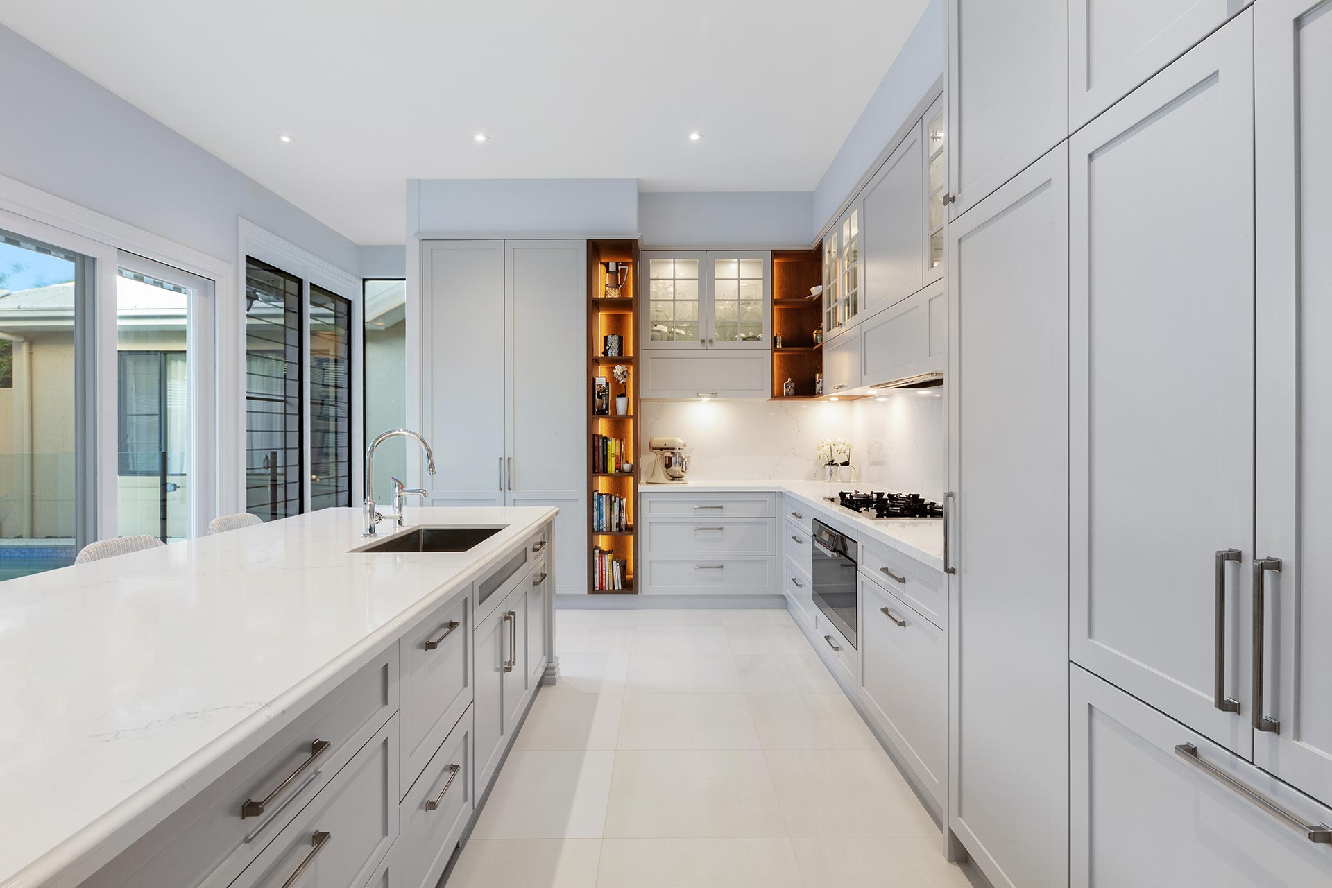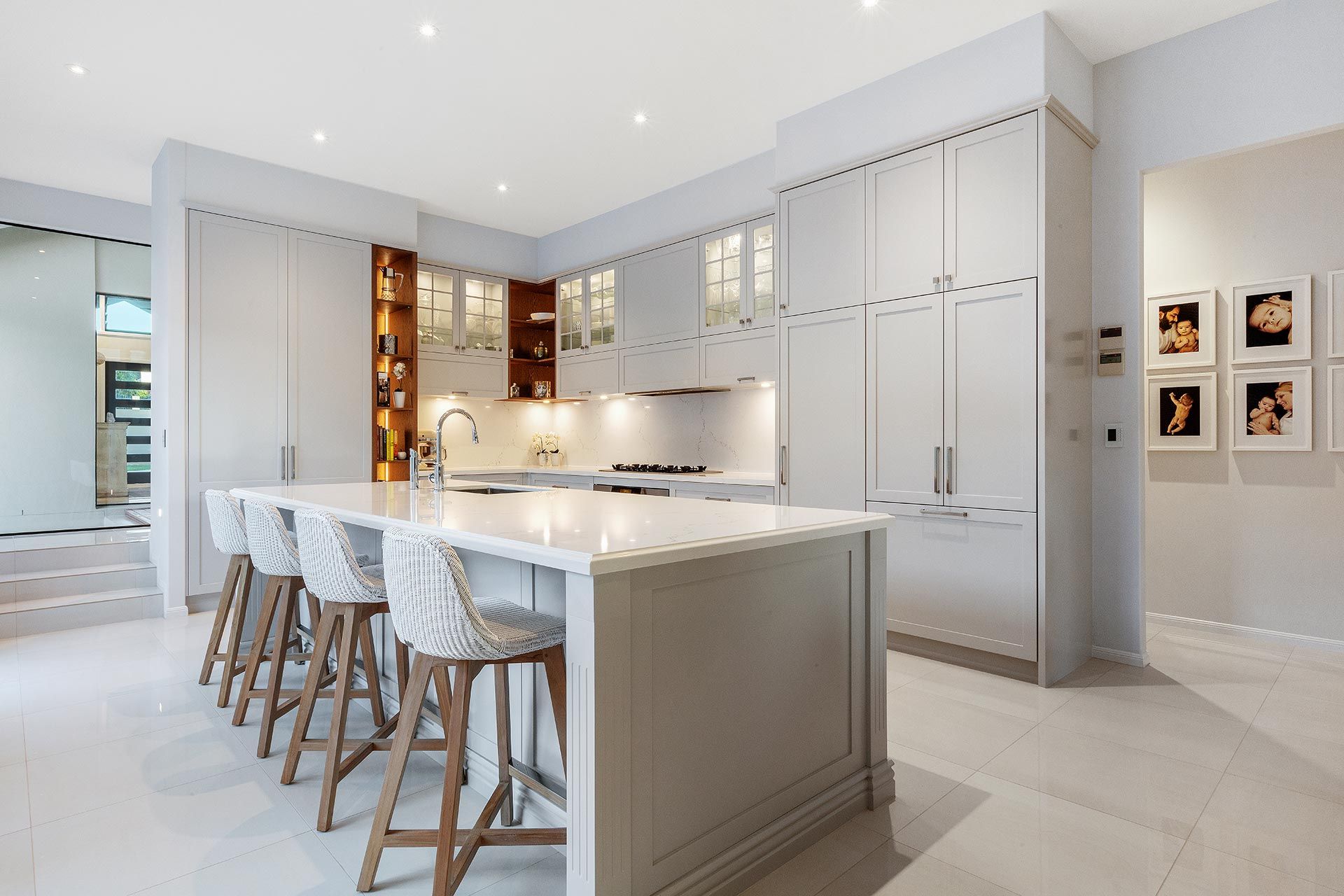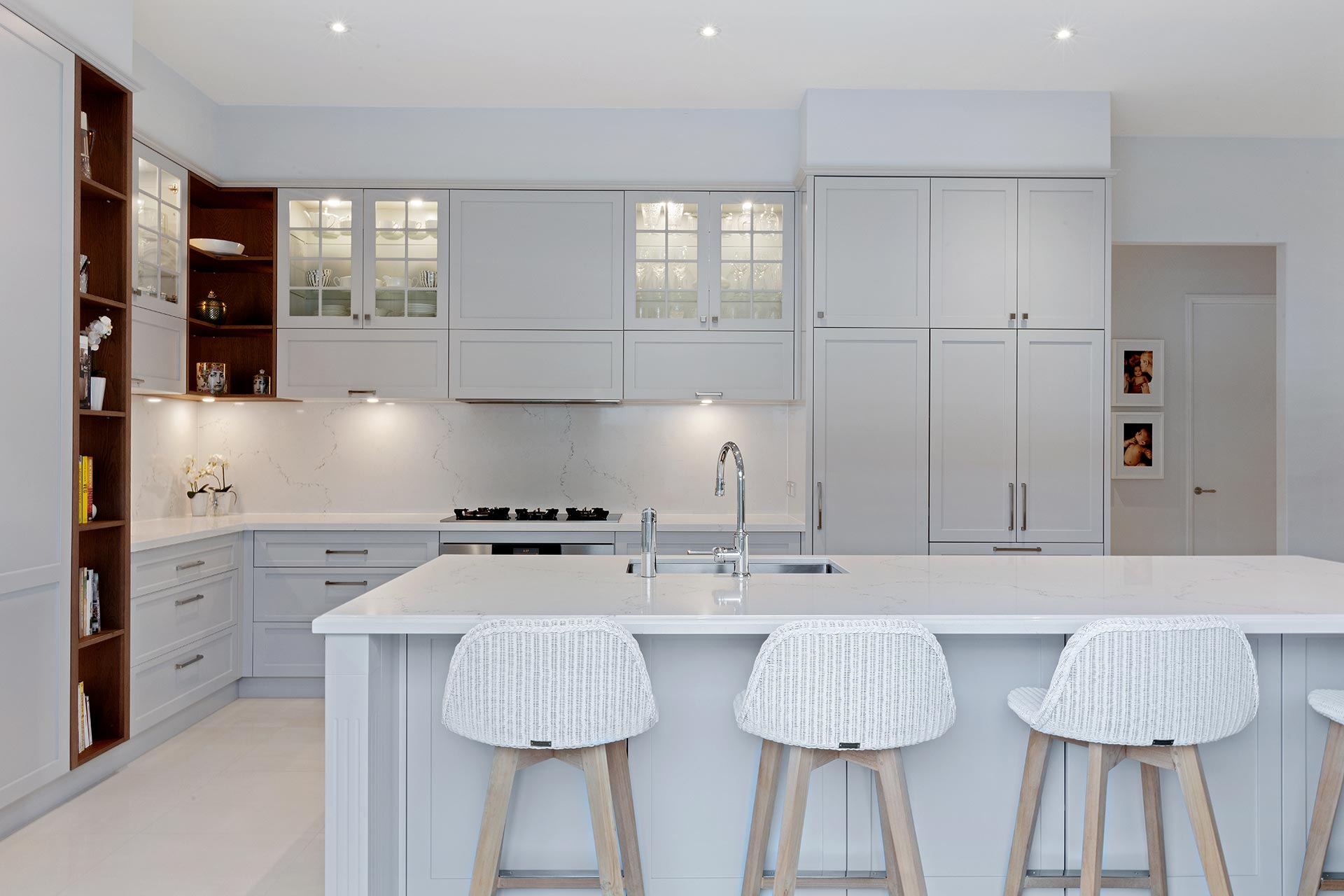 This simplistic kitchen design communicates cohesively with the adjacent dining and living spaces where Hamptons inspired furniture and soft furnishings were selected. The neutral tones of grey and white used throughout the house again act as a supporting canvas for other fixtures and fabrics, which overall leads to a calm, and refined Hamptons style of the client’s preference.