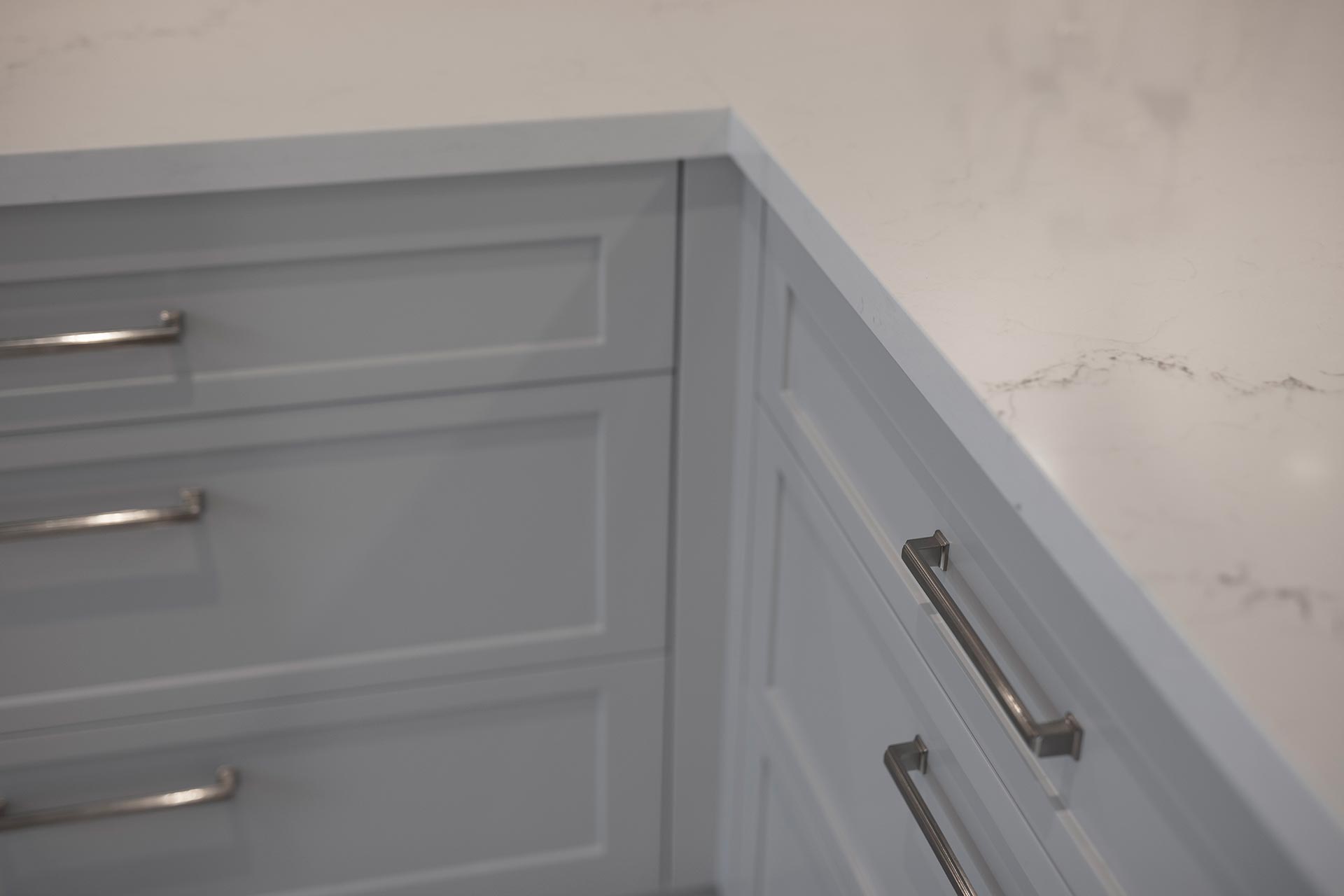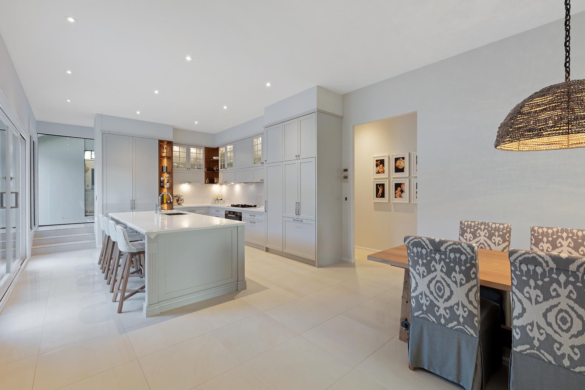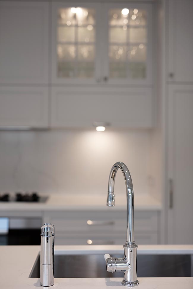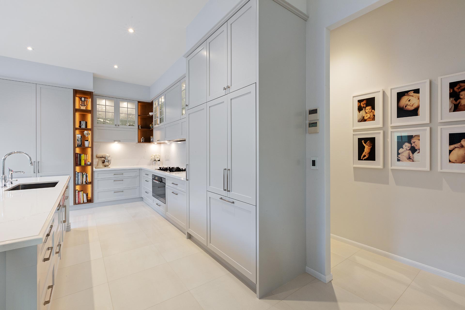 This simplistic kitchen design communicates cohesively with the adjacent dining and living spaces where Hamptons inspired furniture and soft furnishings were selected. The neutral tones of grey and white used throughout the house again act as a supporting canvas for other fixtures and fabrics, which overall leads to a calm, and refined Hamptons style of the client’s preference.