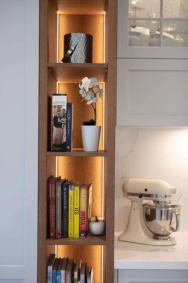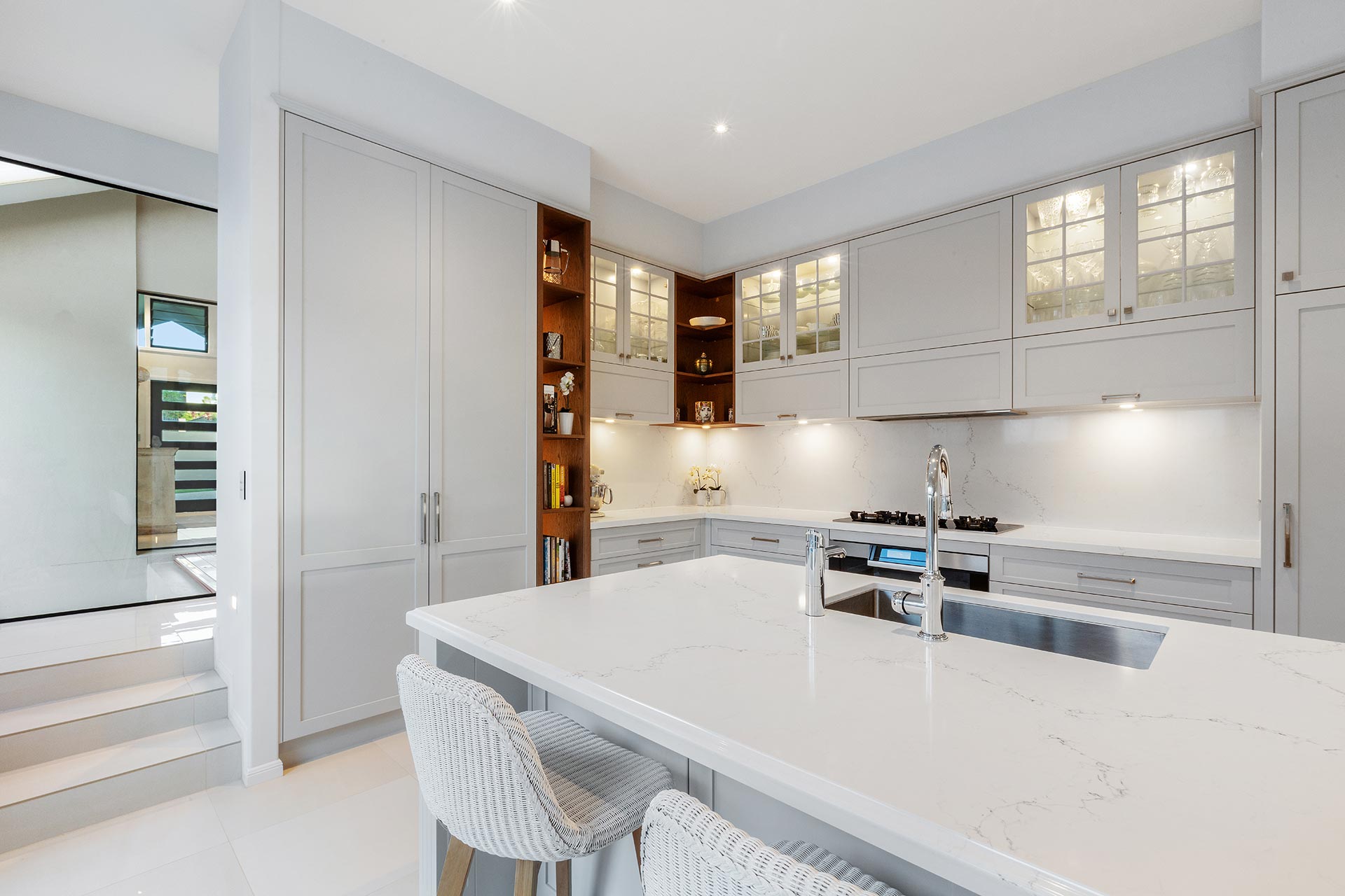 This family home in Buderim involved refurbishment of the kitchen, with the client’s brief of ‘simplified Hamptons’. The layout of half of the kitchen somewhat remained similar, making room for a new spectacular approach to a wide island bench. This bench became the feature, together with the new look cabinetry design and the colour palette. Both of which have transformed the space dramatically to achieve the fresh, grey-white Hamptons atmosphere. The existing sculptural bulkhead was also demolished to emphasize the high 3m ceilings, which helped with natural light filtering through the open planned Kitchen space. The selected white benchtop with soft grey veins provides the crisp contrast against the grey cabinetry, featuring shaker door panels and feature glazing bars. Lighting selection was also a key to this project where a mixture of recessed down light and strip lighting were specified to enhance open display shelving. The timber farmhouse shelving with back lighting illuminates the kitchen space adding warmth and texture. The textured timber elements included in the kitchen finishes selection inspired the design of a customised recycled dining table which completed the theme for the kitchen dining space.