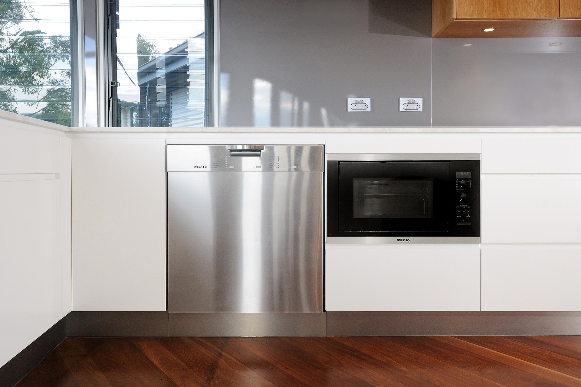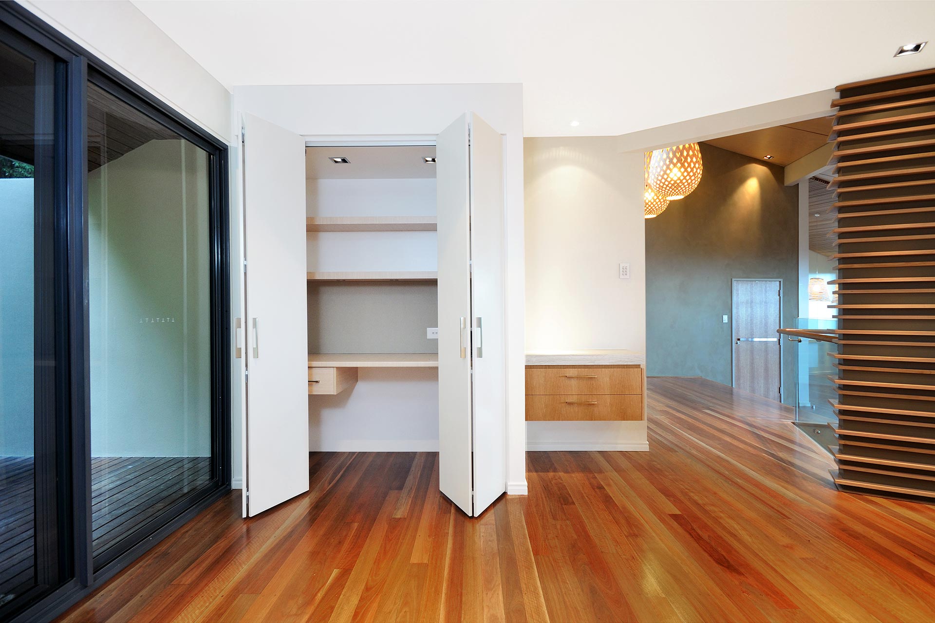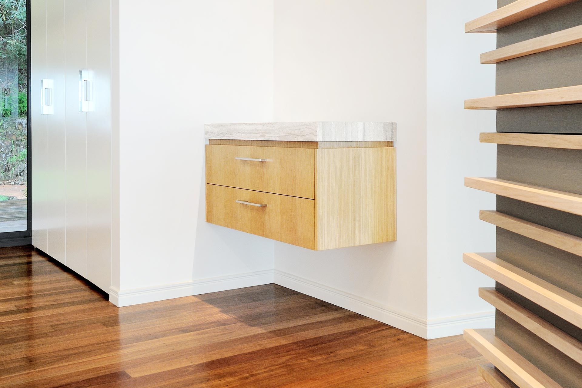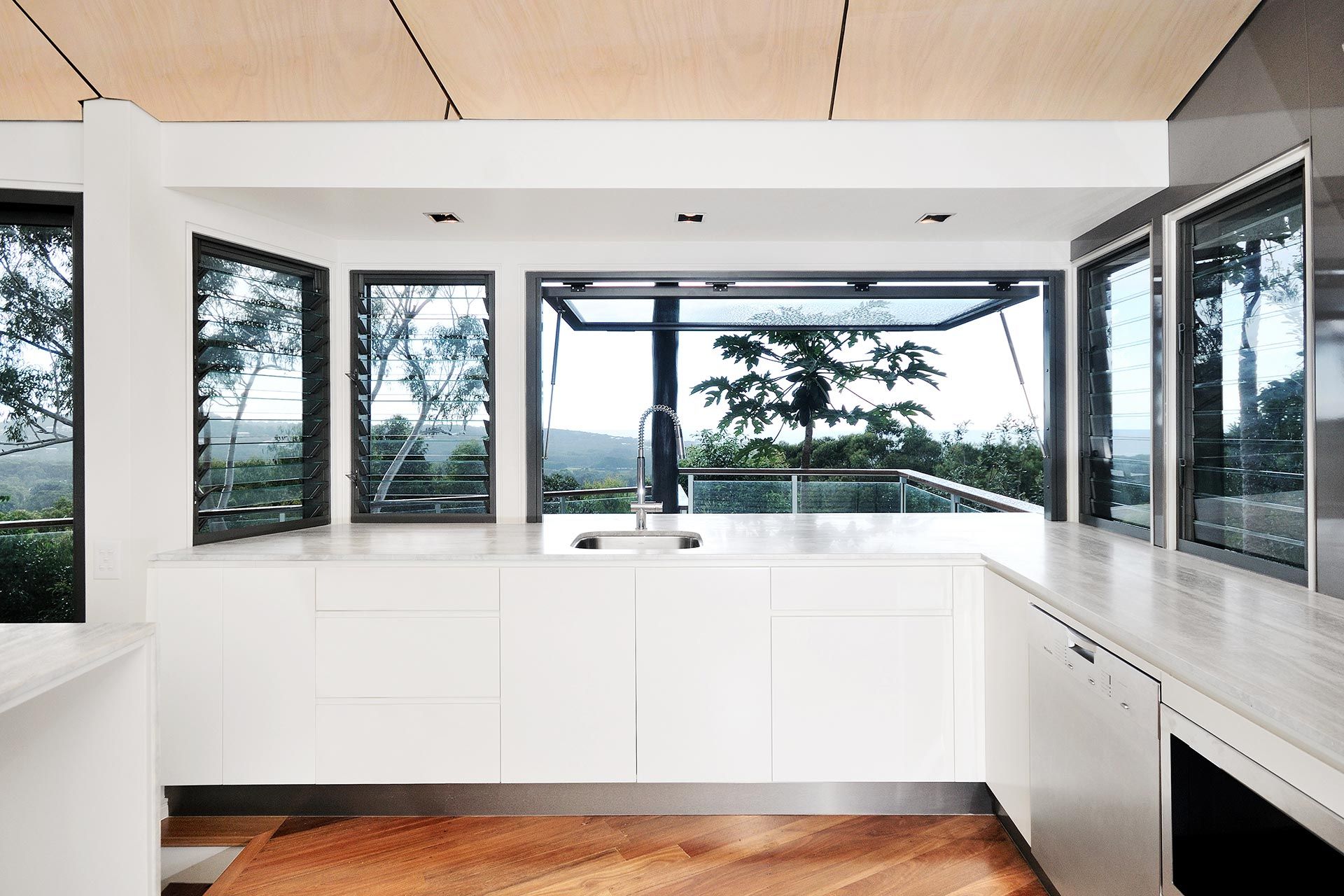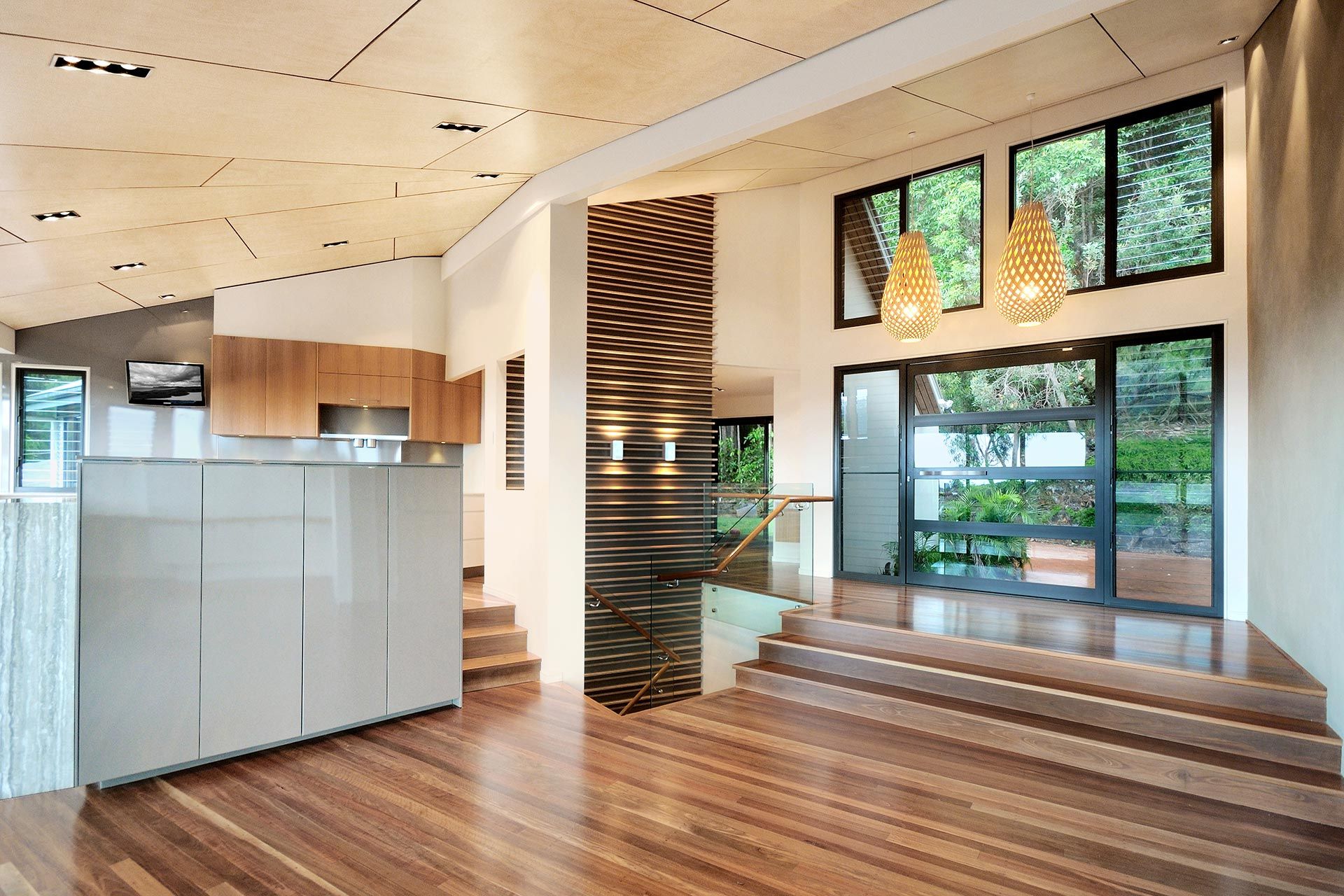 The refurbishment involved new light kitchen cabinetry highlighting the black window frames that captured the panoramic vistas out to the surrounding Coolum hillside. Introducing a light palette and light timber finishes throughout provided surfaces for natural light reflection. The Feature element was the timber battened staircase wall that included smart lighting fixtures and frameless glass balustrade. The stained ply ceiling brought a coastal appeal to the home.