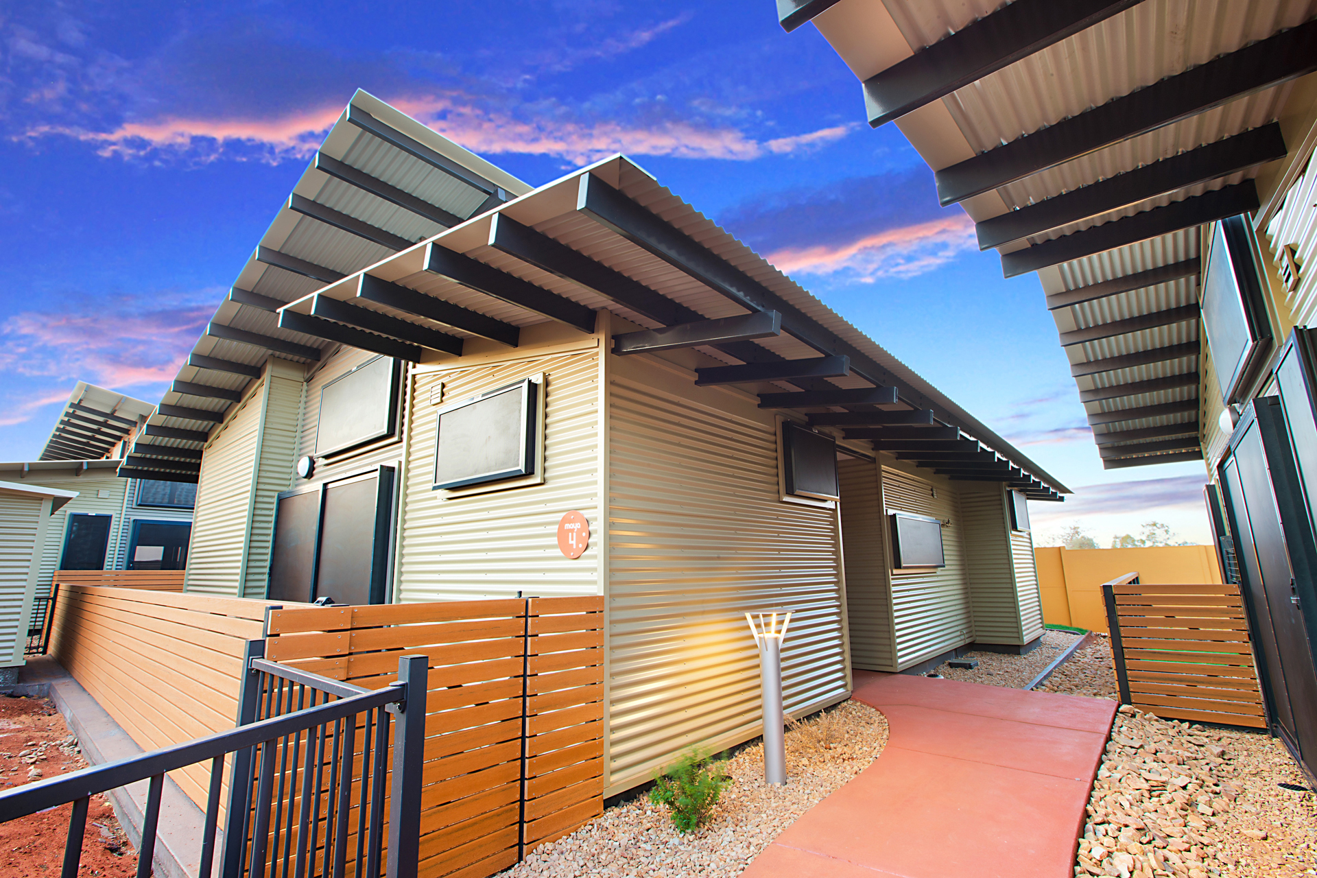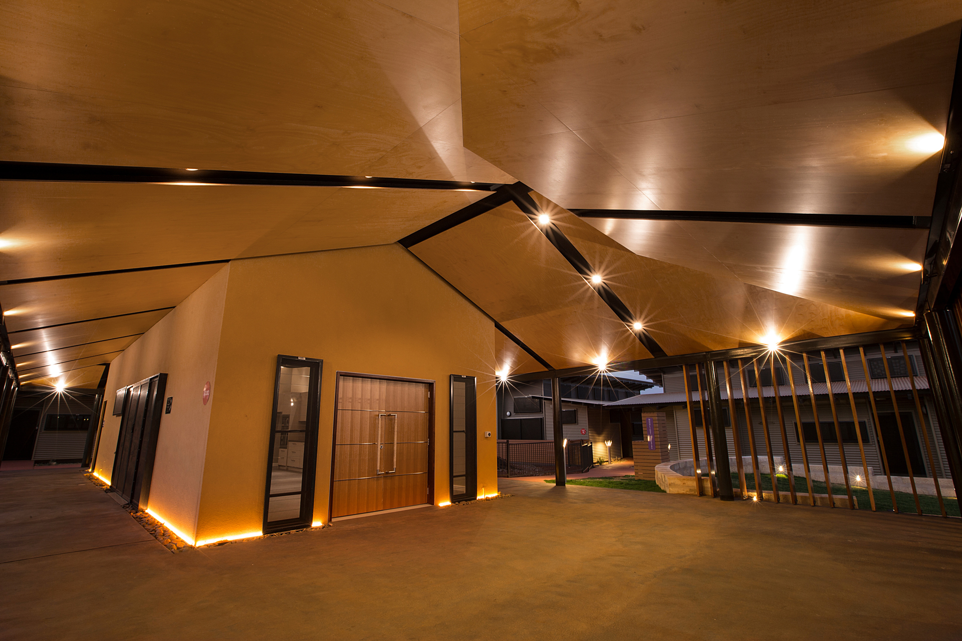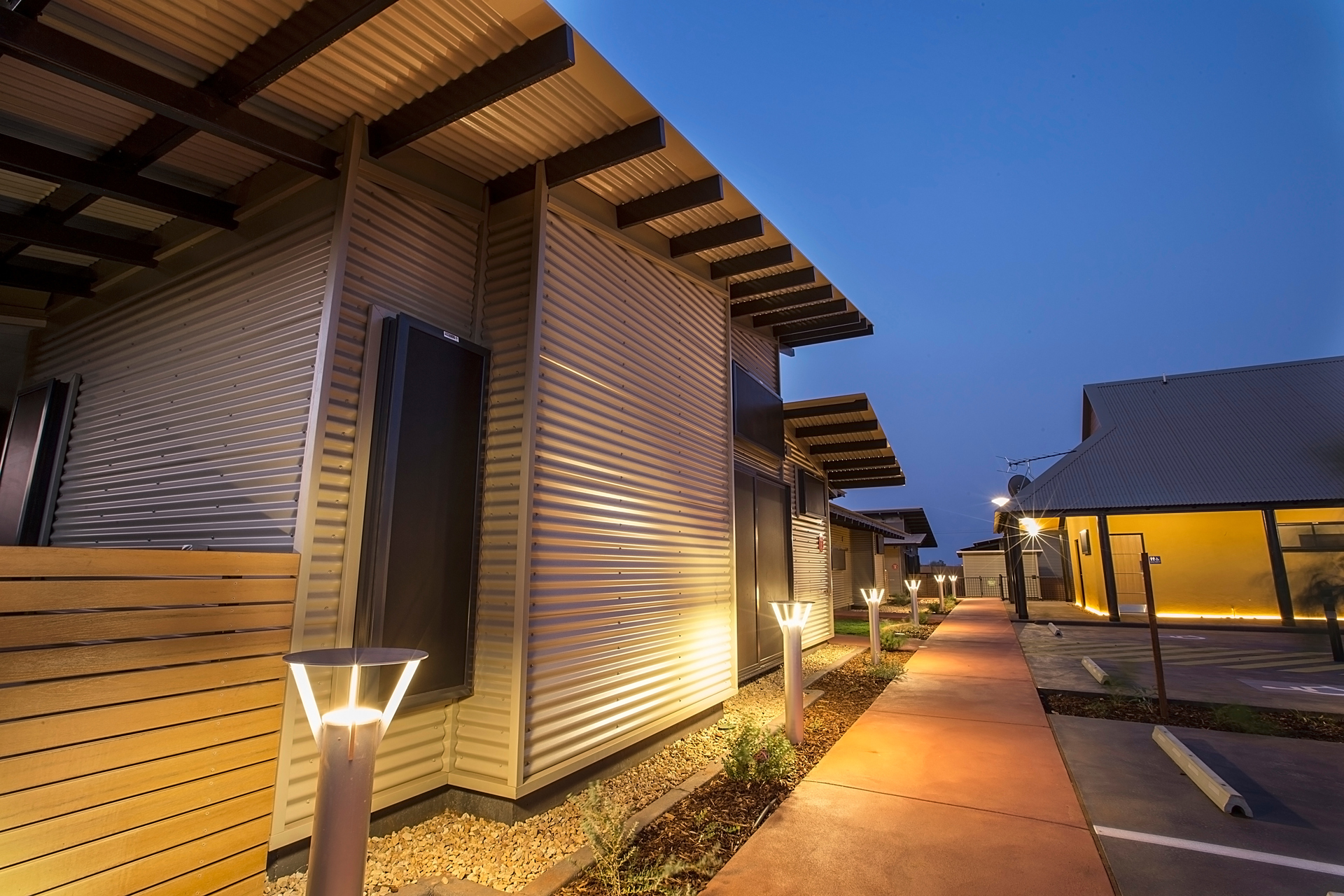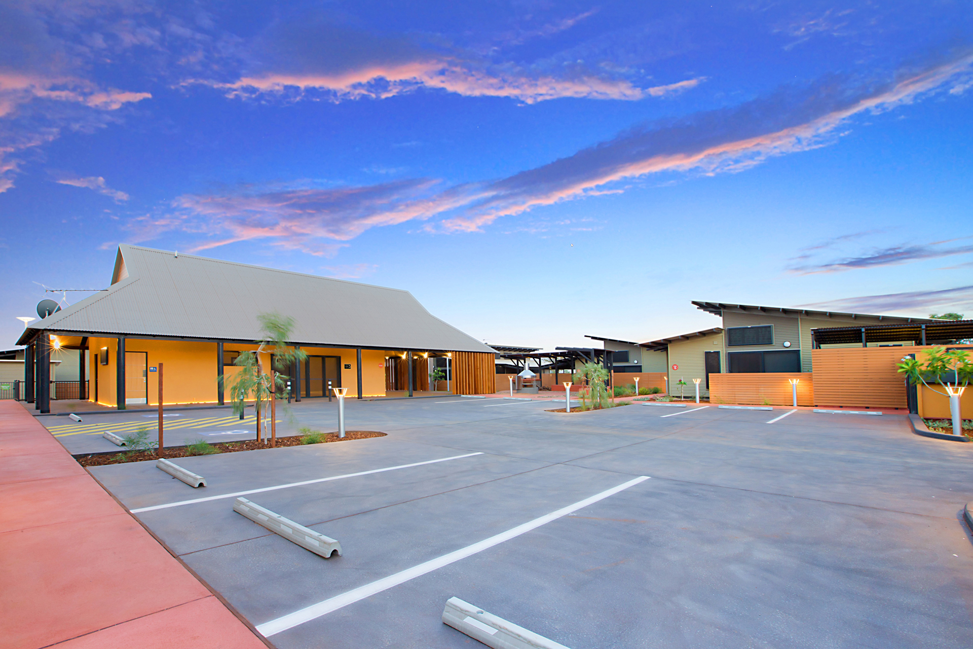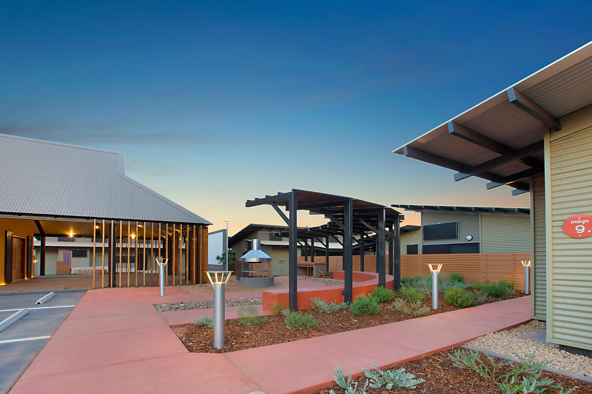 The Ngarluma Aboriginal Corporation (NAC) initiated the housing community project with the aim of addressing a number of cultural, social and physical requirements of the Ngarluma elders. The site is located in the Pilbara within the Yaburriji Estate. The nine units were designed to accommodate the needs of the Ngarluma elders and to promote their position in the community as mentors and role models for the middle aged and younger Aboriginal people. The mentoring is facilitated through a number of communal spaces that are spread around the core of the village. The strong colour palette present was inspired by an artwork created by one of the Ngarluma Elders and supported the Ngarluma tradition of creating art.