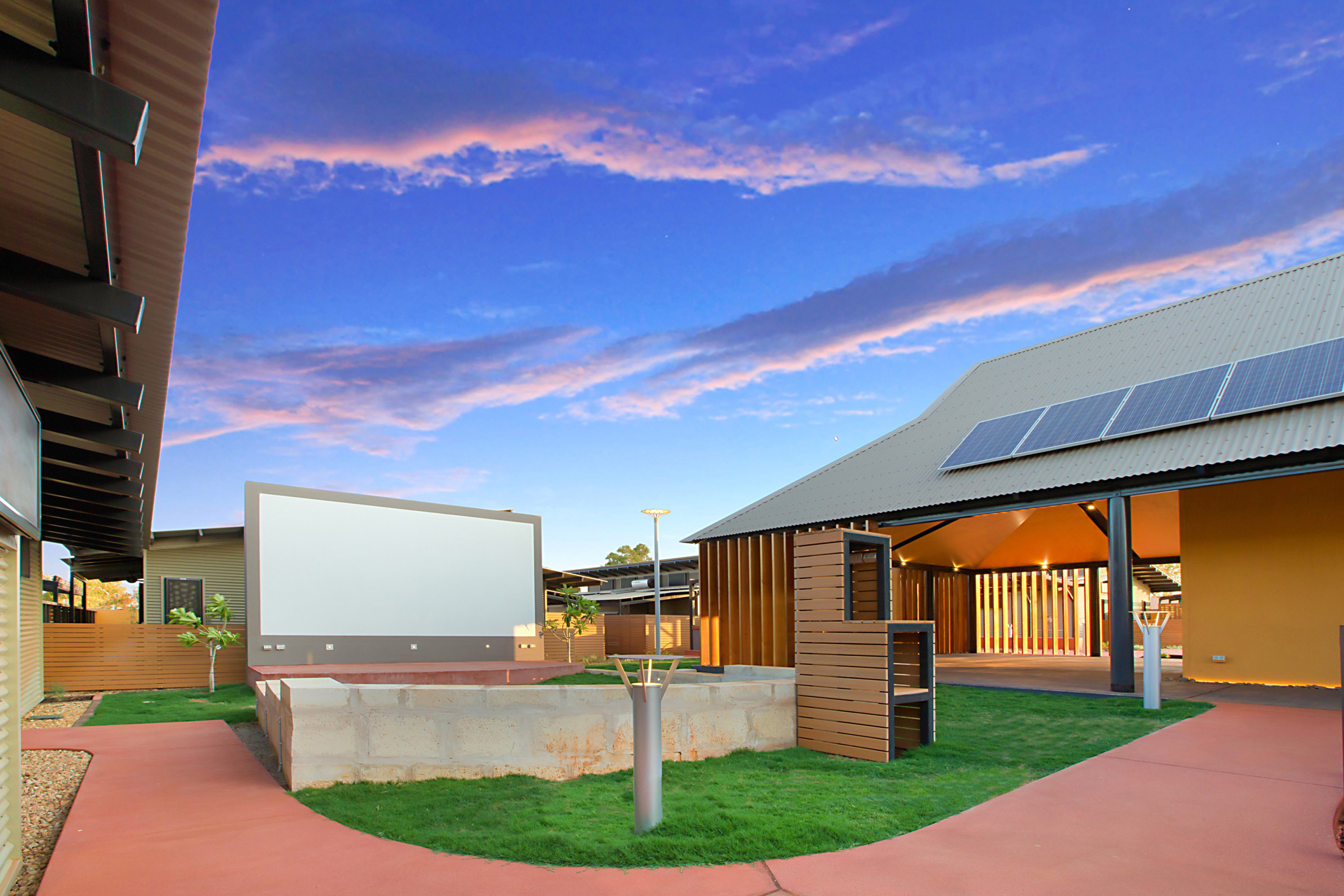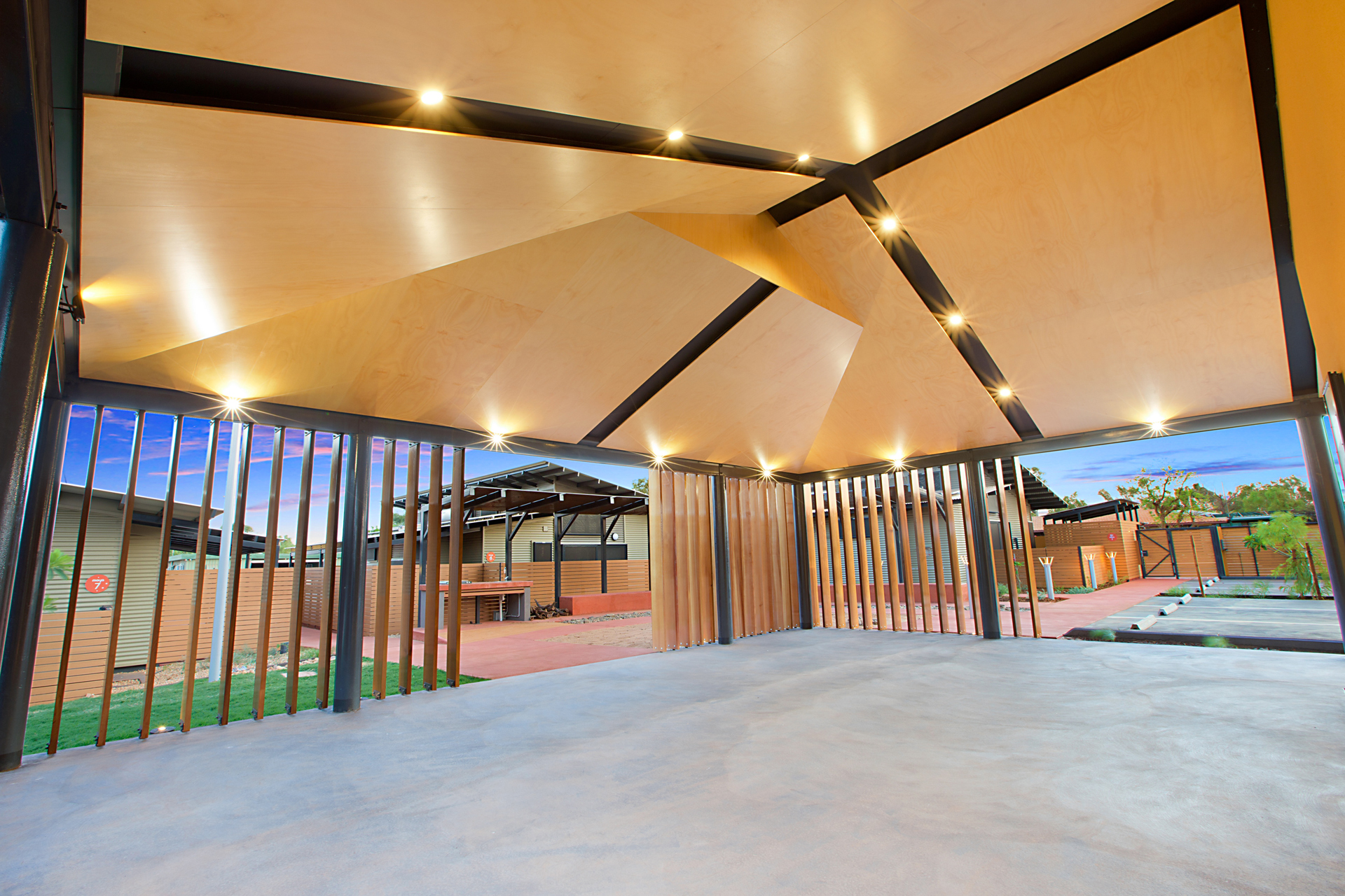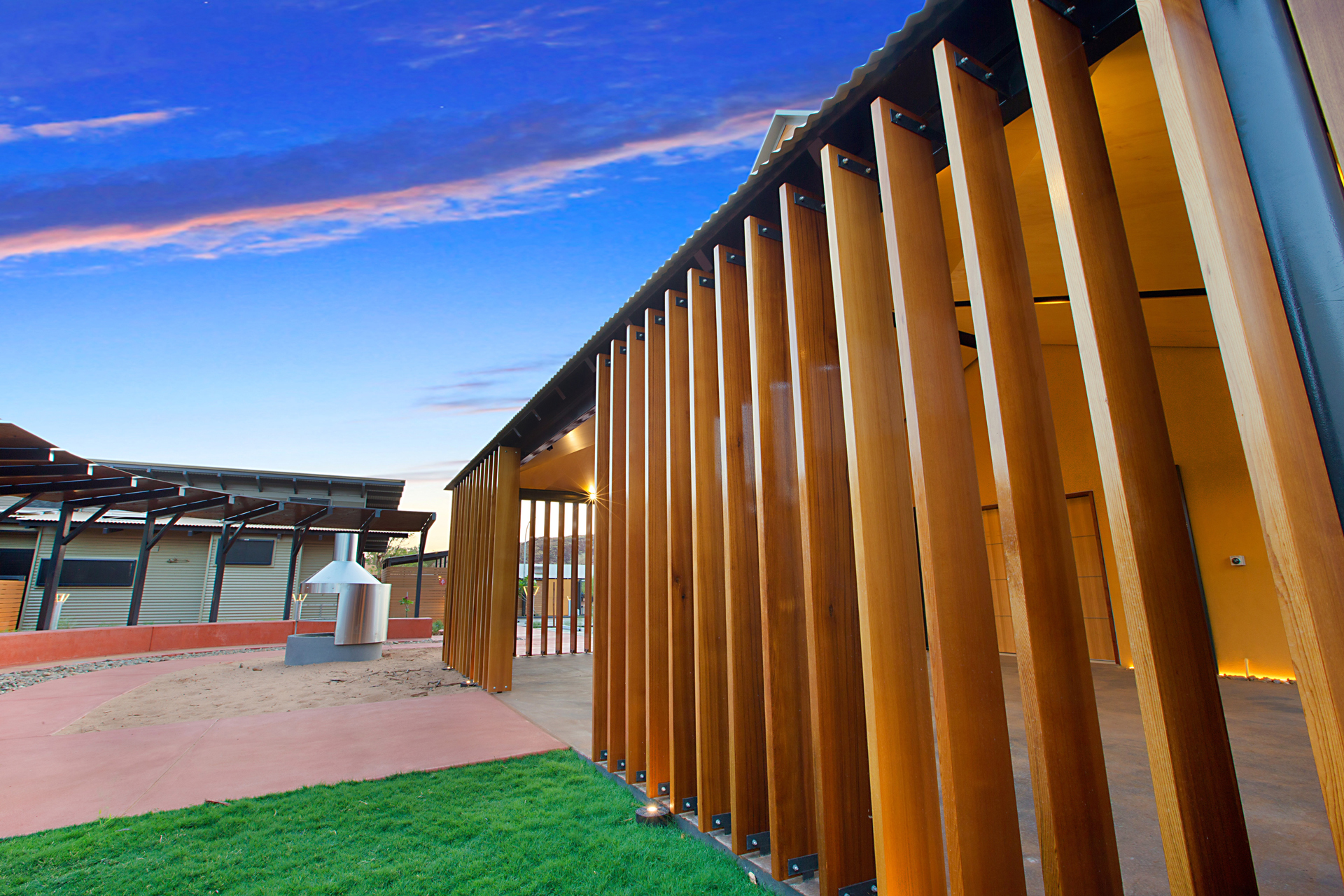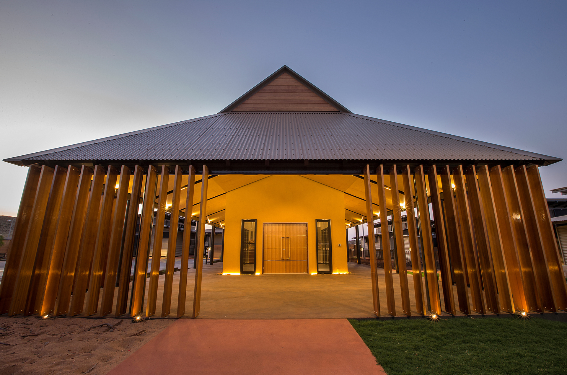 The Ngarluma Aboriginal Corporation (NAC) initiated the housing community project with the aim of addressing a number of cultural, social and physical requirements of the Ngarluma elders. The site is located in the Pilbara within the Yaburriji Estate. The nine units were designed to accommodate the needs of the Ngarluma elders and to promote their position in the community as mentors and role models for the middle aged and younger Aboriginal people. The mentoring is facilitated through a number of communal spaces that are spread around the core of the village. The strong colour palette present was inspired by an artwork created by one of the Ngarluma Elders and supported the Ngarluma tradition of creating art.